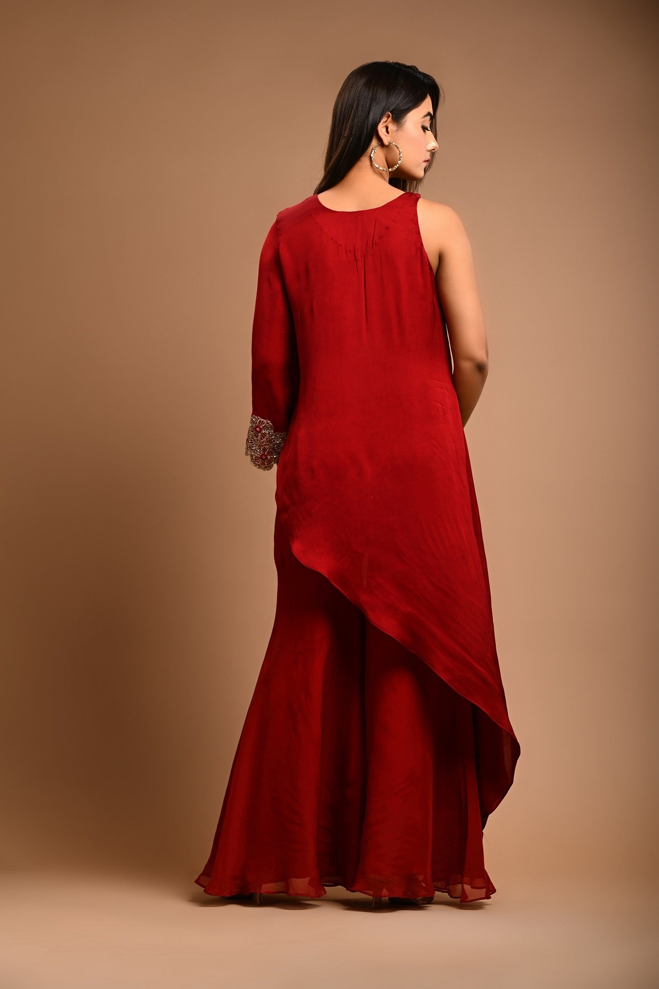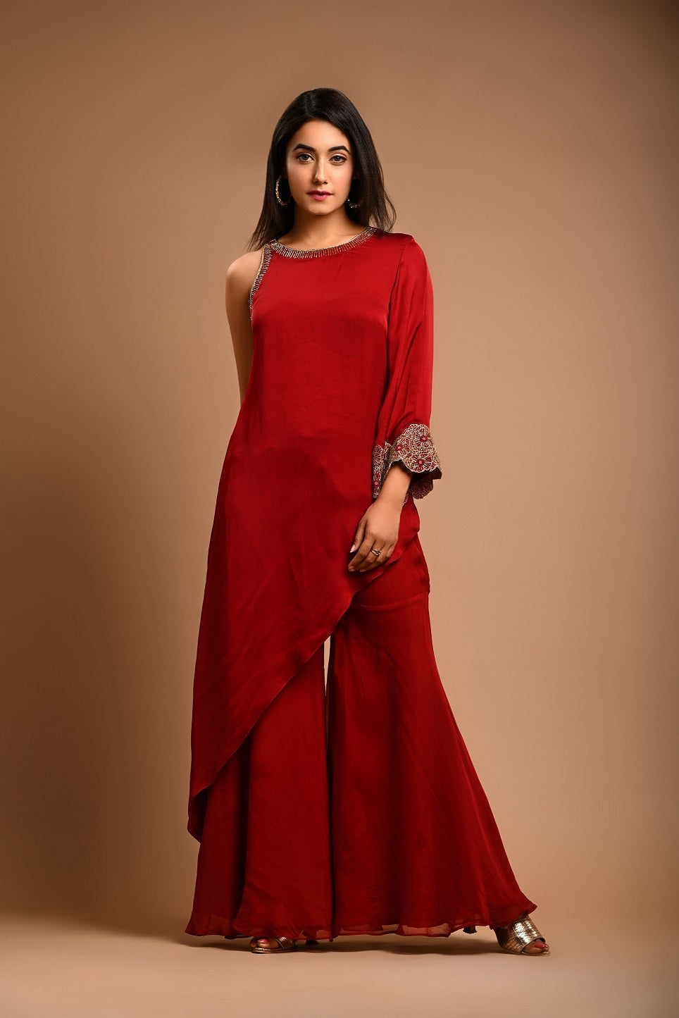 Asymmetrical Top With One Side Halter Neck, Hand Embroidery On The Neck And One Sleeve Along With Circular Pants.